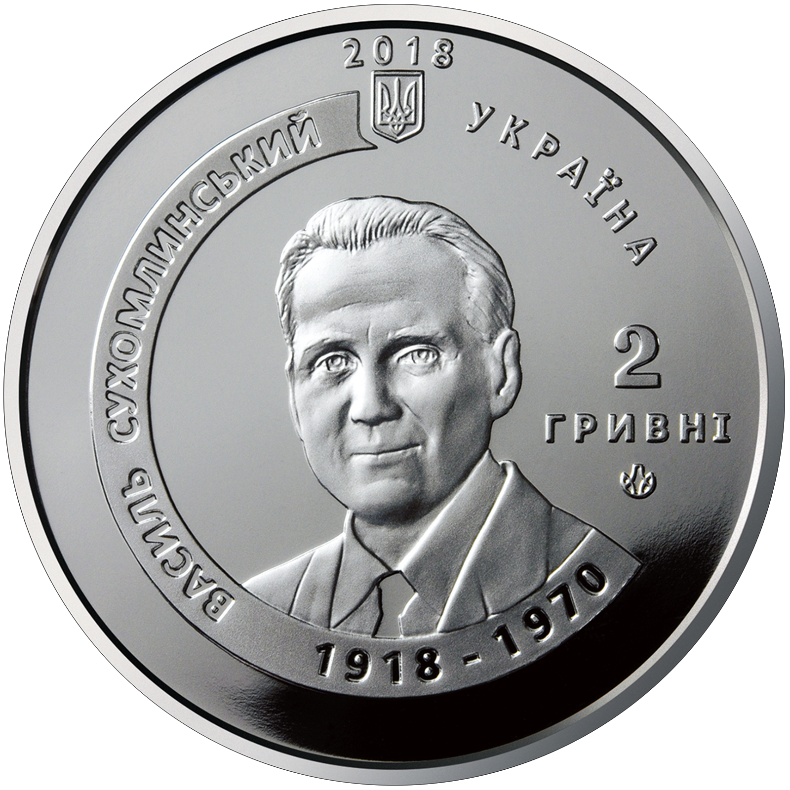 На аверсі монети розміщено: угорі - малий Державний Герб України, праворуч від якого напис УКРАЇНА (півколом), рік карбування монети - 2018 (над гербом); у центрі на дзеркальному тлі - зображено портрет В. О. Сухомлинського, праворуч номінал - 2/ГРИВНІ та логотип Банкнотно-монетного двору Національного банку України; написи півколом на матовому тлі: ВАСИЛЬ СУХОМЛИНСЬКИЙ (ліворуч), 1918 - 1970 (під портретом).