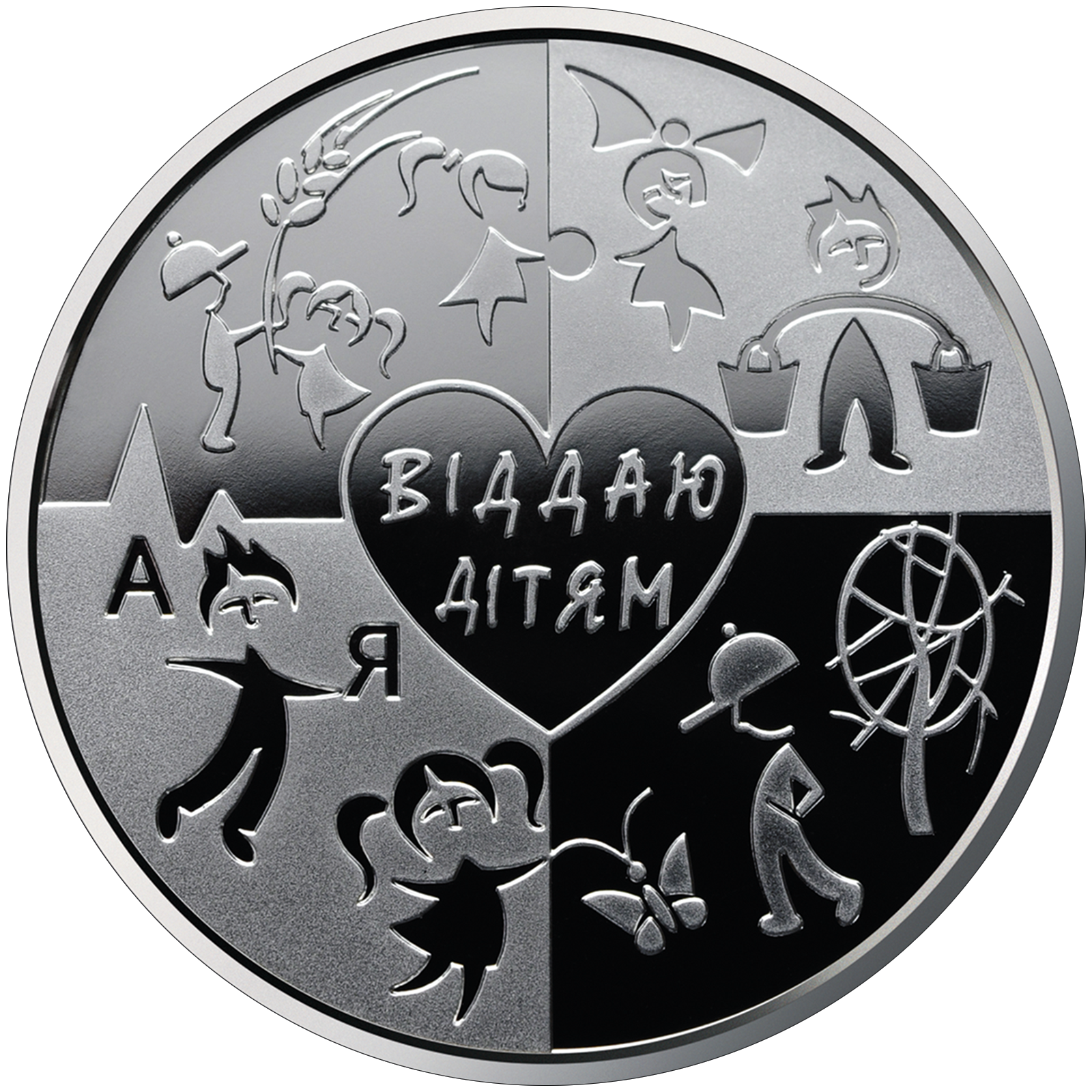 На реверсі монети розміщено серце, у центрі якого напис: ВІДДАЮ ДІТЯМ, навколо серця - стилізовані персонажі з оповідань В. Сухомлинського.
