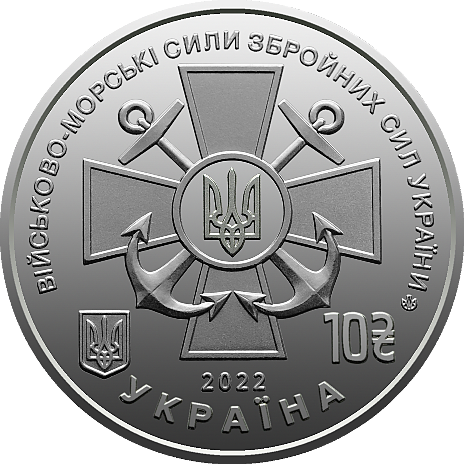 На аверсі монети розміщено: у центрі на дзеркальному тлі – емблема Військово-морських сил ЗСУ, унизу ліворуч від неї – малий Державний Герб України, унизу праворуч – номінал 10 та графічний символ гривні; написи: ВІЙСЬКОВО-МОРСЬКІ СИЛИ ЗБРОЙНИХ СИЛ УКРАЇНИ (півколом угорі), 2022/УКРАЇНА (унизу); логотип Банкнотно-монетного двору Національного банку України (праворуч від номіналу).