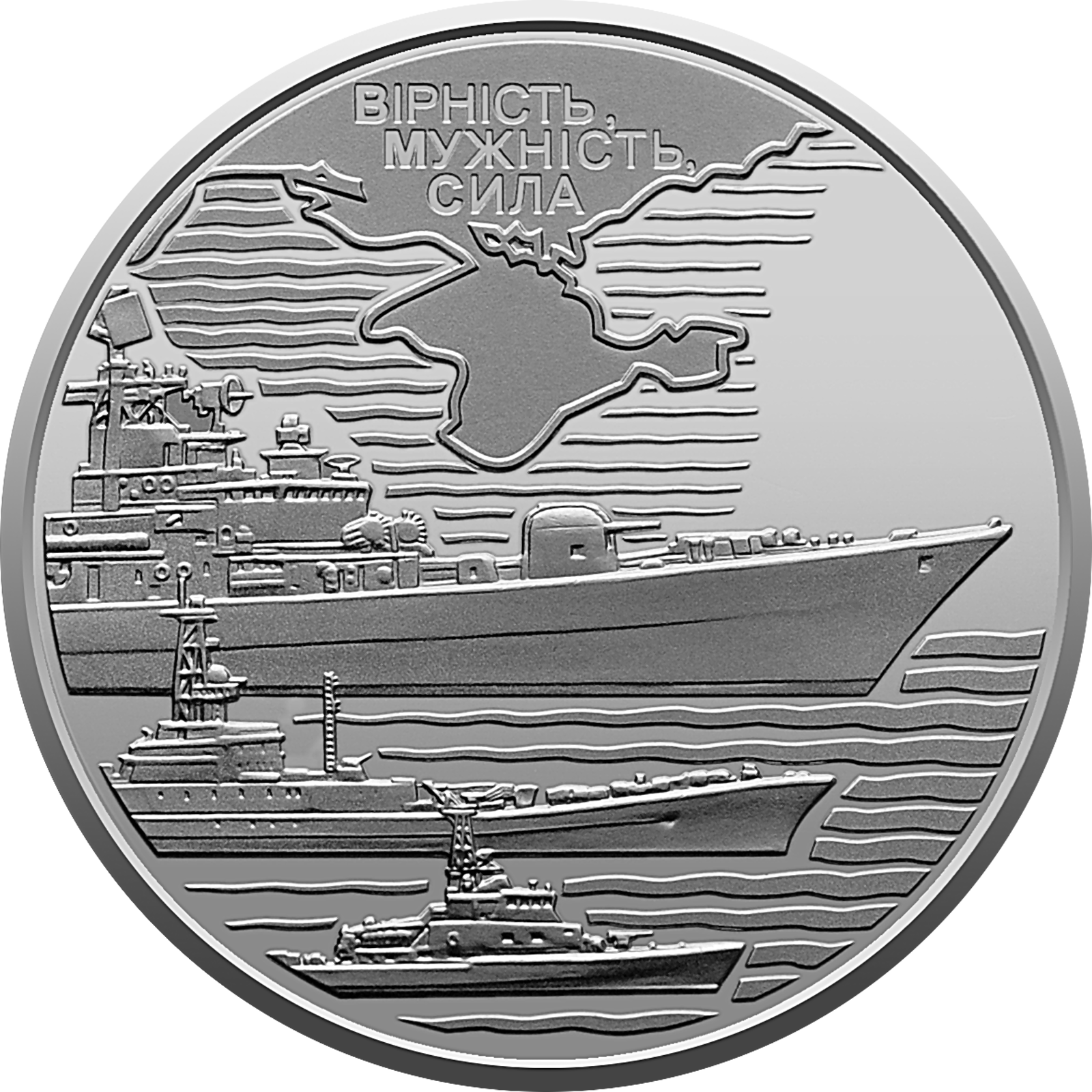 На реверсі монети на тлі стилізованих хвиль зображено різні типи кораблів як символ ВМС ЗСУ, до складу яких, крім надводних сил, також входять морська авіація, морська піхота, берегова артилерія та інші компоненти; угорі на тлі позначених південних морських рубежів нашої держави та виключної морської економічної зони України – написи: ВІРНІСТЬ,/МУЖНІСТЬ,/СИЛА.