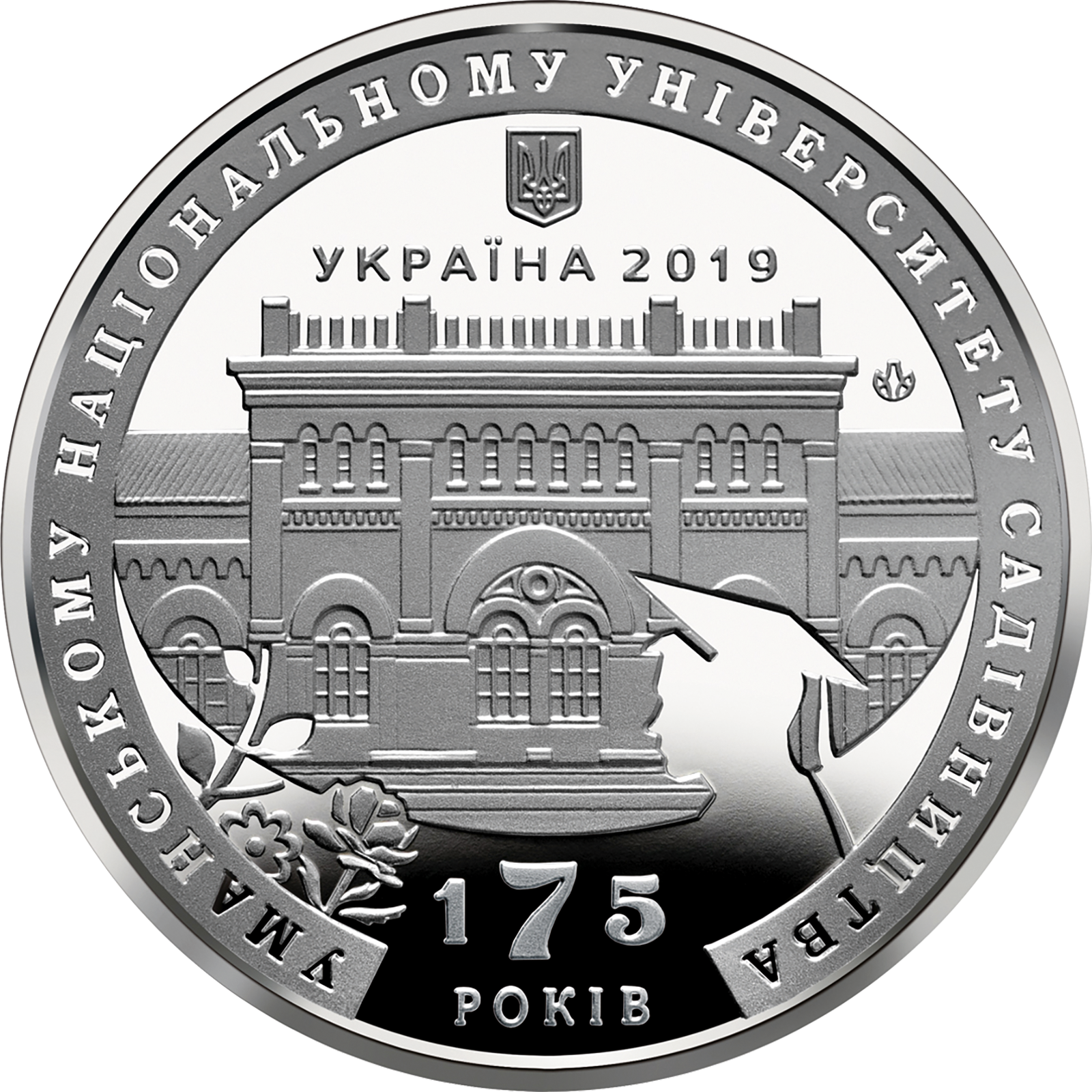 На аверсі медалі розміщено: угорі на дзеркальному тлі малий Державний Герб України, під яким написи: УКРАЇНА 2019, у центрі – будівля університету, на тлі якої – дзеркальний абрис студента (праворуч) та зображення рослин (ліворуч); по колу на матовому тлі написи: УМАНСЬКОМУ НАЦІОНАЛЬНОМУ УНІВЕРСИТЕТУ САДІВНИЦТВА; унизу на дзеркальному тлі – 175/РОКІВ. Логотип Банкнотно-монетного двору Національного банку України (угорі праворуч від будівлі).