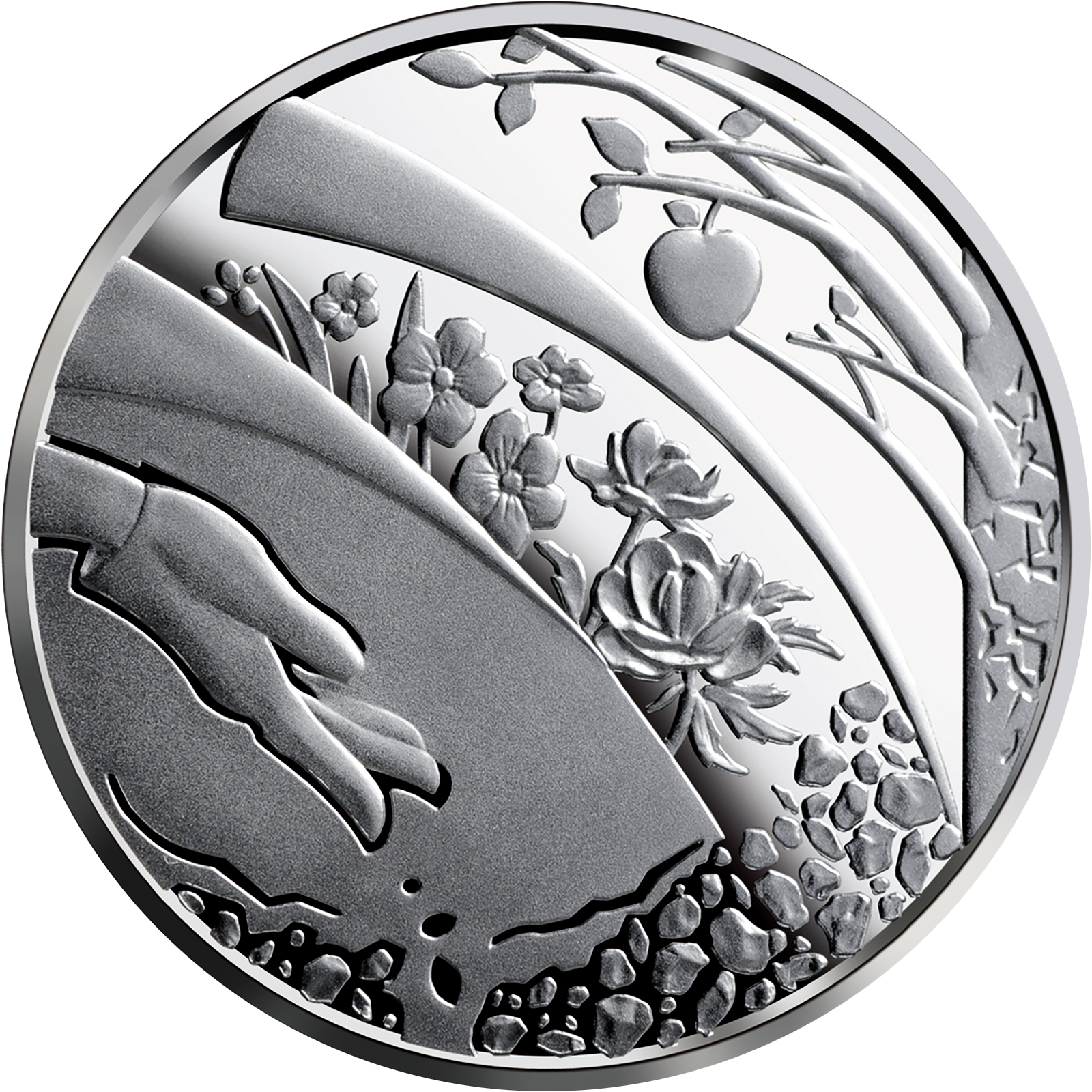 На реверсі медалі розміщено стилізовану композицію, що символізує мистецтво садівника, який із любов’ю вирощує сад: на передньому плані на матовому тлі – рука, що кидає в землю насіння, на дзеркальному тлі – квіти і дерево з плодом.