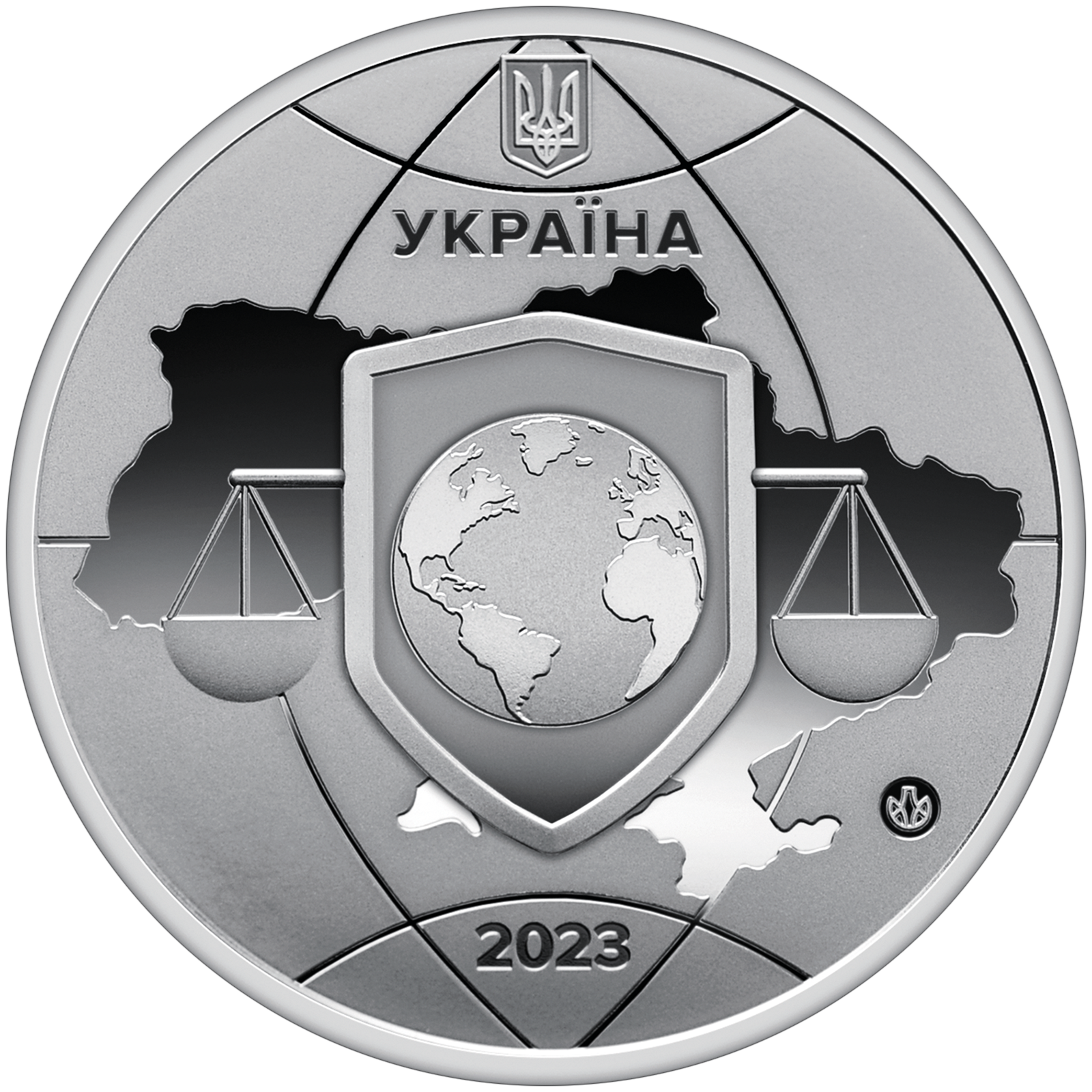 На аверсі медалі розміщено стилізовану композицію, яка символізує те, що справедливість для України означає справедливість та безпеку для всього світу: у центрі композиції – карта України, на якій розміщено щит із зображенням планети Земля, по обидва боки від якого – шальки терезів правосуддя; угорі та внизу – малий Державний Герб України та напис УКРАЇНА, рік карбування 2023.